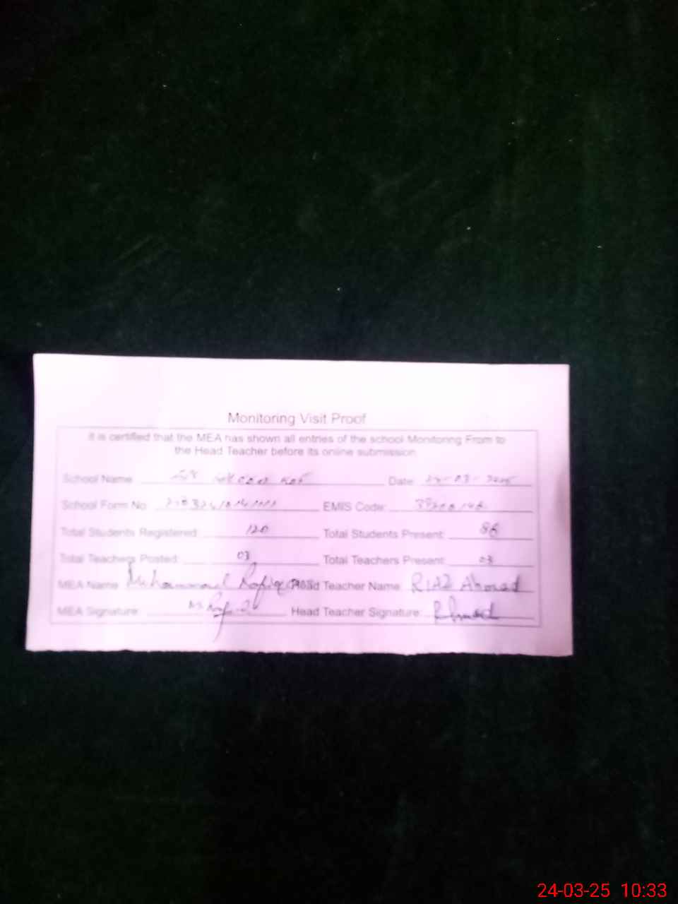 | Attendance Register | Head Teacher | MEA with School | Visit Proof |