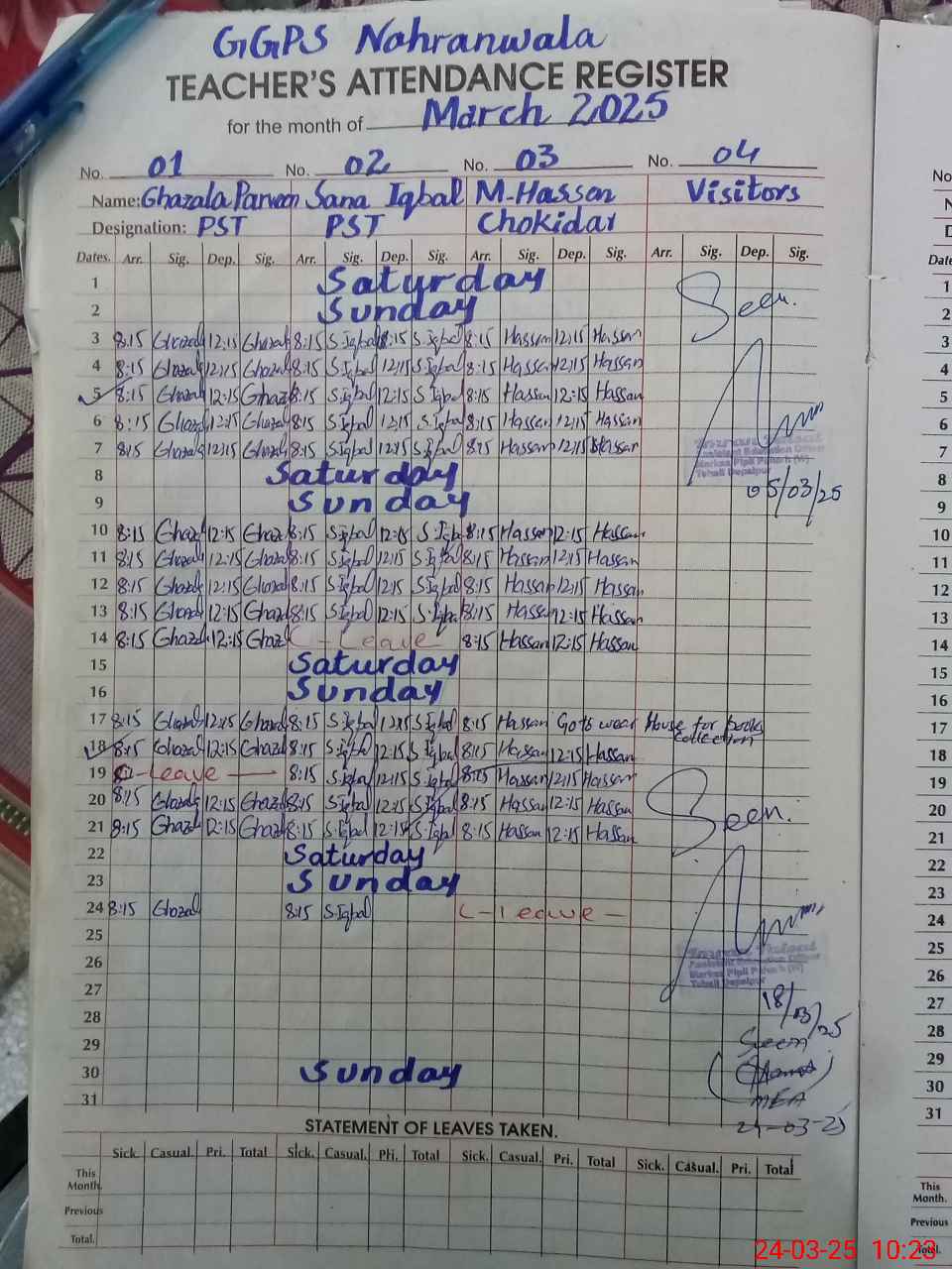 | Leave | Duty | Absent | Maternity | Medical | Ex- Pak |