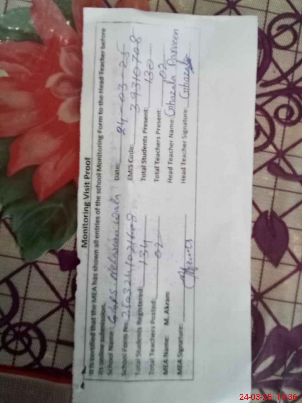 | Attendance Register | Head Teacher | MEA with School | Visit Proof |