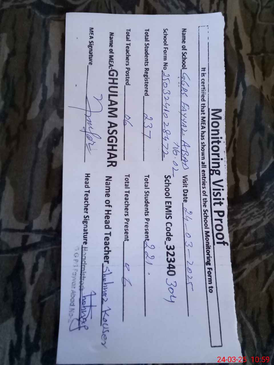 | Attendance Register | Head Teacher | MEA with School | Visit Proof |