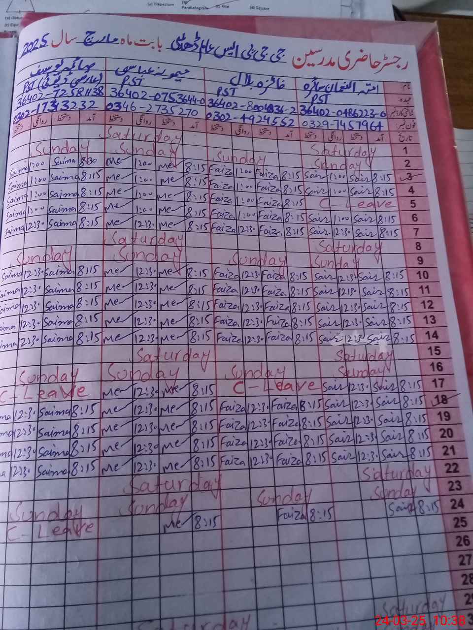 | Leave | Duty | Absent | Maternity | Medical | Ex- Pak |