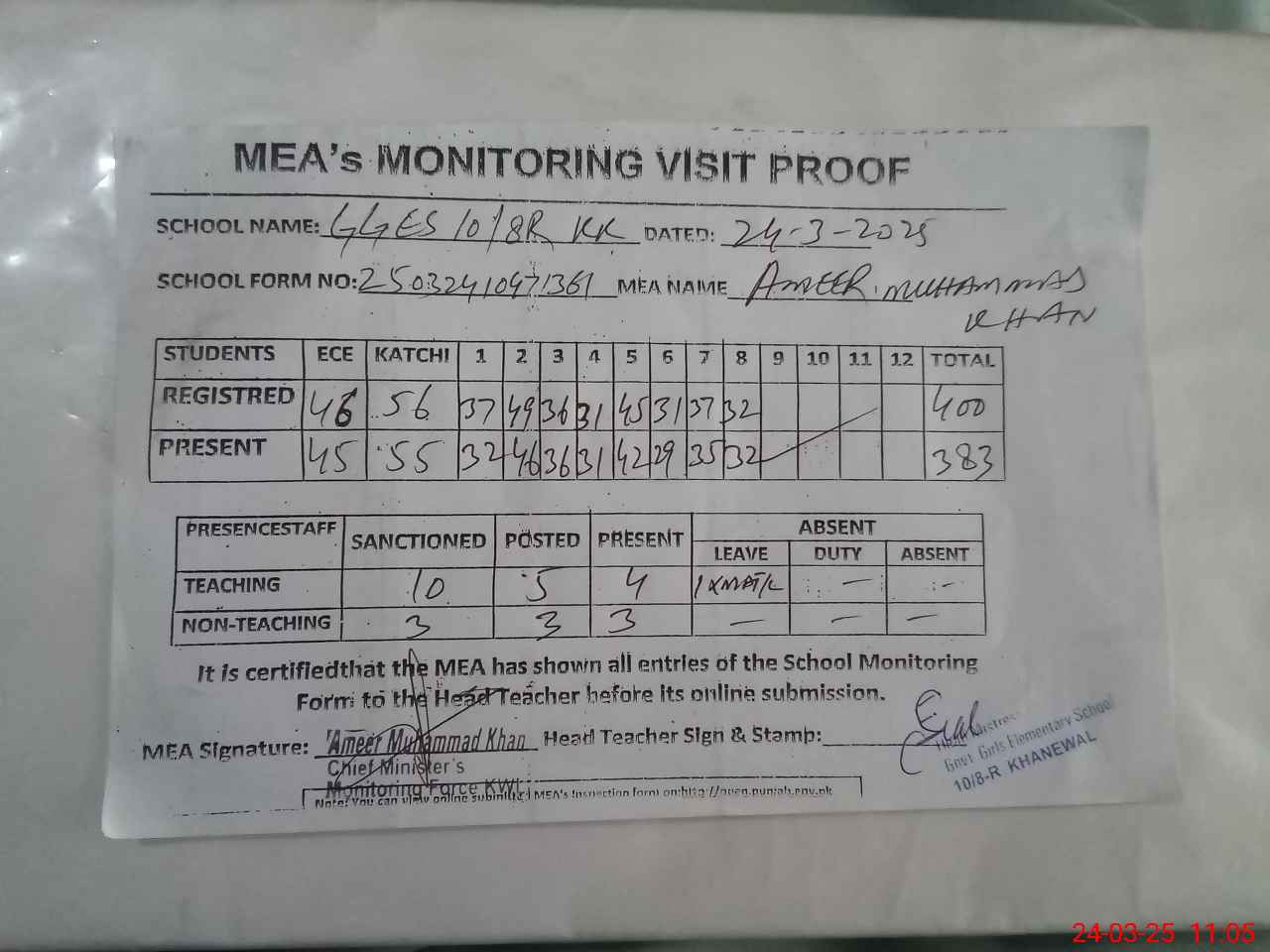 | Attendance Register | Head Teacher | MEA with School | Visit Proof |