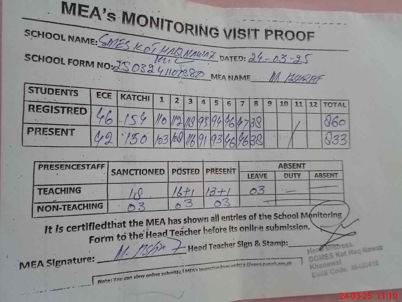| Attendance Register | Head Teacher | MEA with School | Visit Proof |