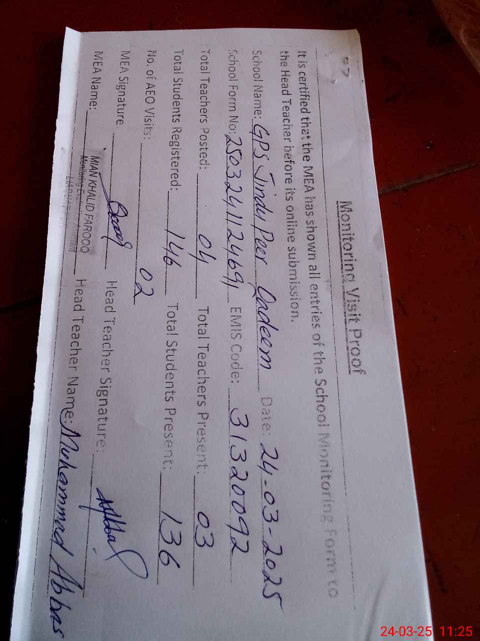 | EMIS Code: 31320092 | Name of School: GPS JINDU PEER QADEEM | |||
