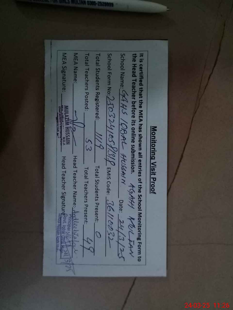 | EMIS Code: 36110032 | Name of School: GGHS IQBAL HUSSAIN AGAHI ROAD MULTAN | |||