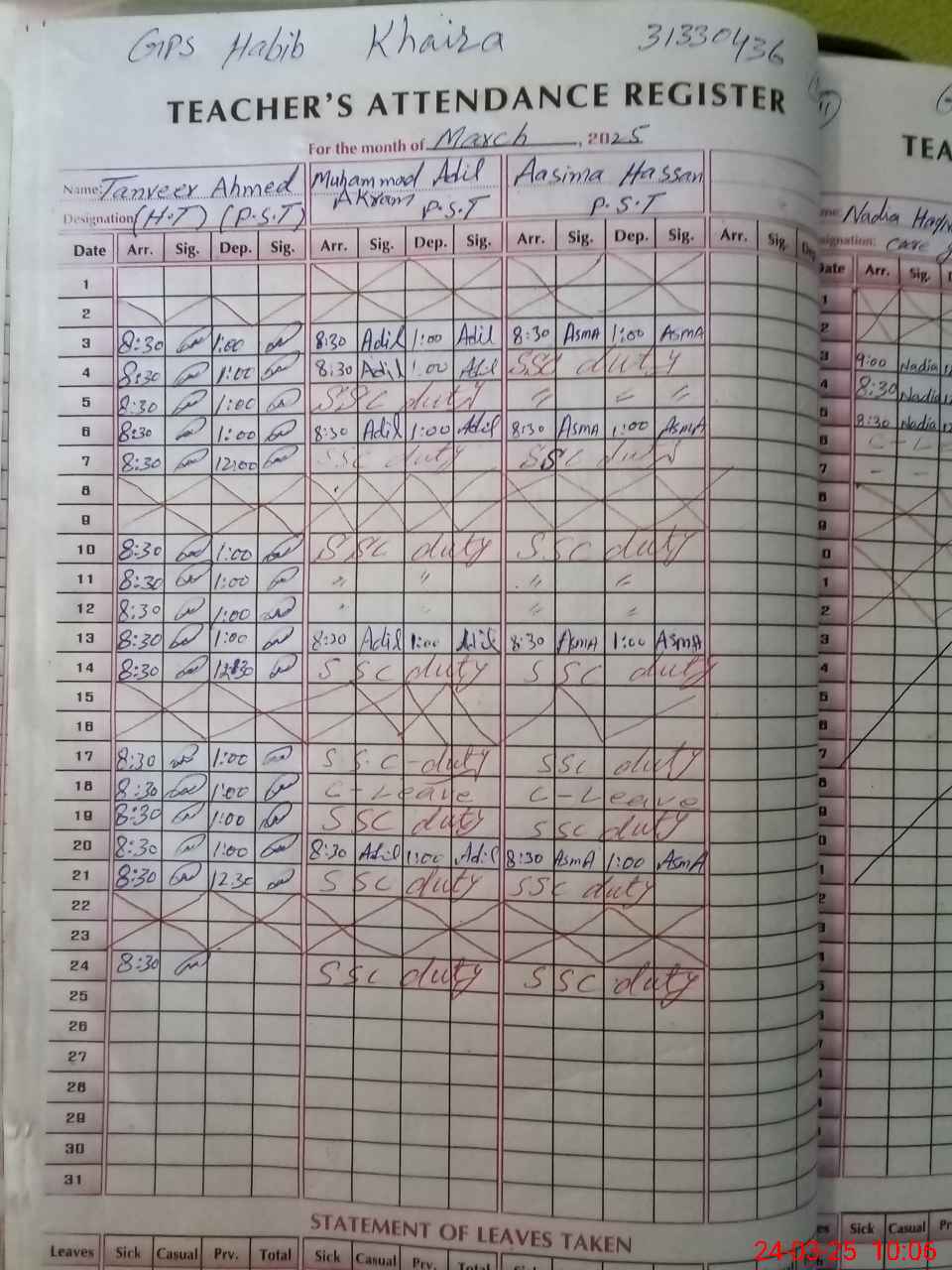 | 31**** | Aa**** Ha**** | PST | Regular | 0 | 0 | 0 | 0 | 0 | 0 | 0 | 0 | 0 | Absent (Un-Authorized) |