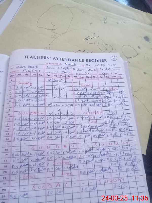 | 37**** | Kh**** Sh**** | Feader Teacher | Temporary | 0 | 0 | 0 | 0 | 0 | 0 | 0 | 0 | 0 | Absent (Un-Authorized) |