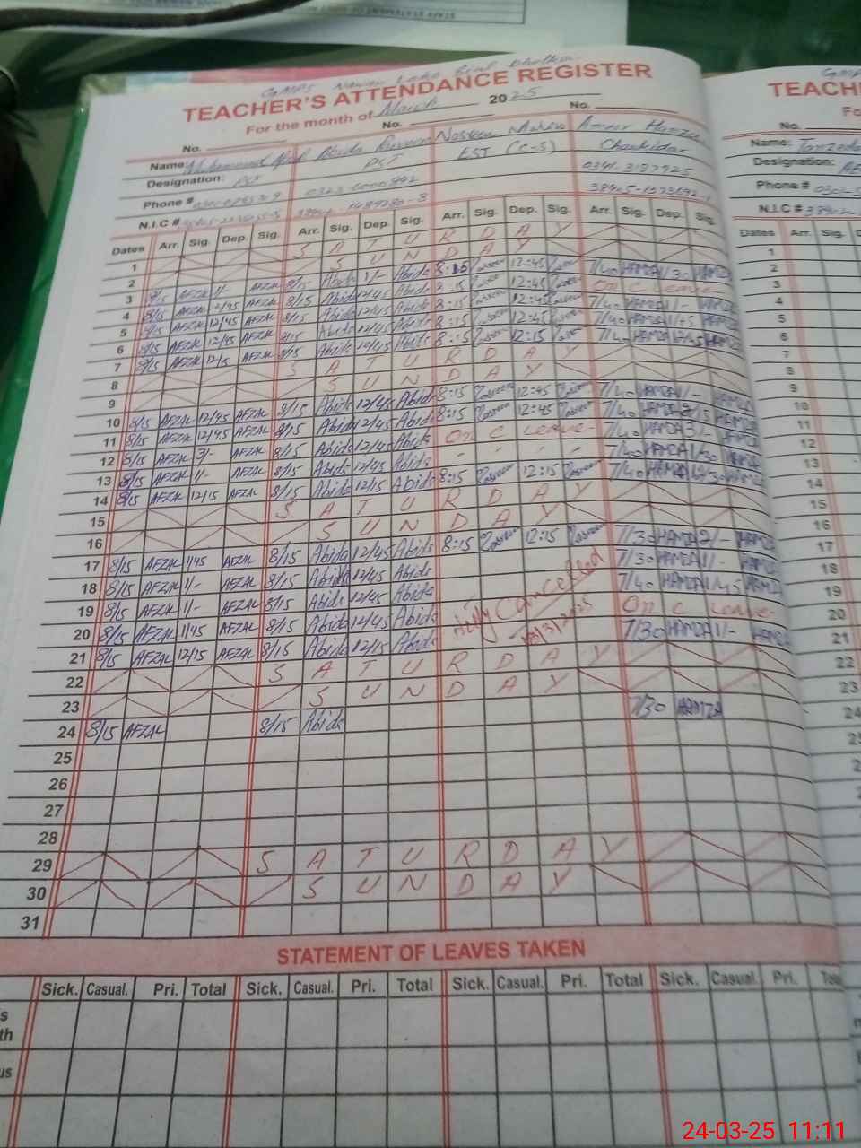 | CNIC | Full Name | Designation | R/C | Absence During Last Calender Month |