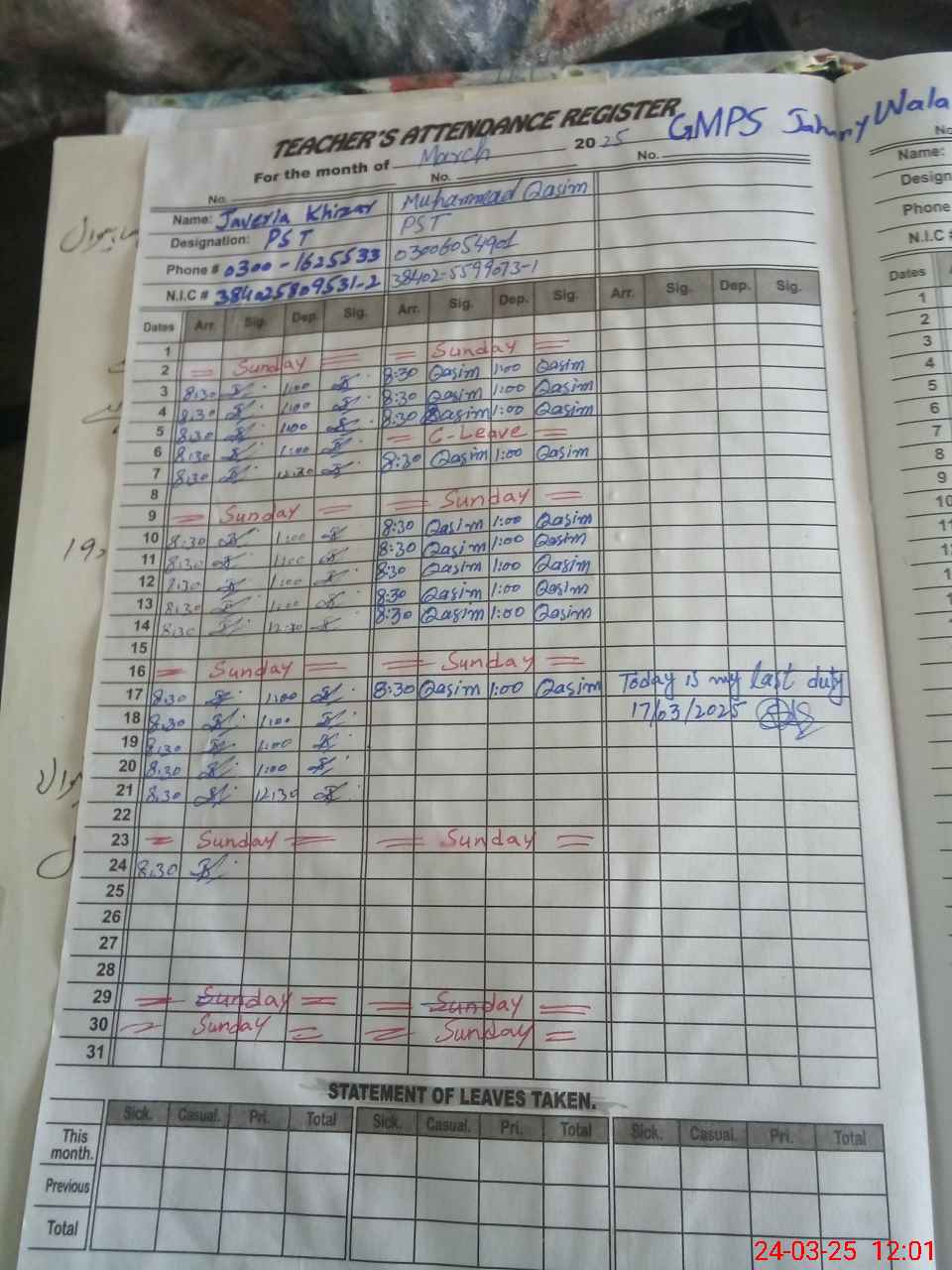 | CNIC | Full Name | Designation | R/C | Absence During Last Calender Month |