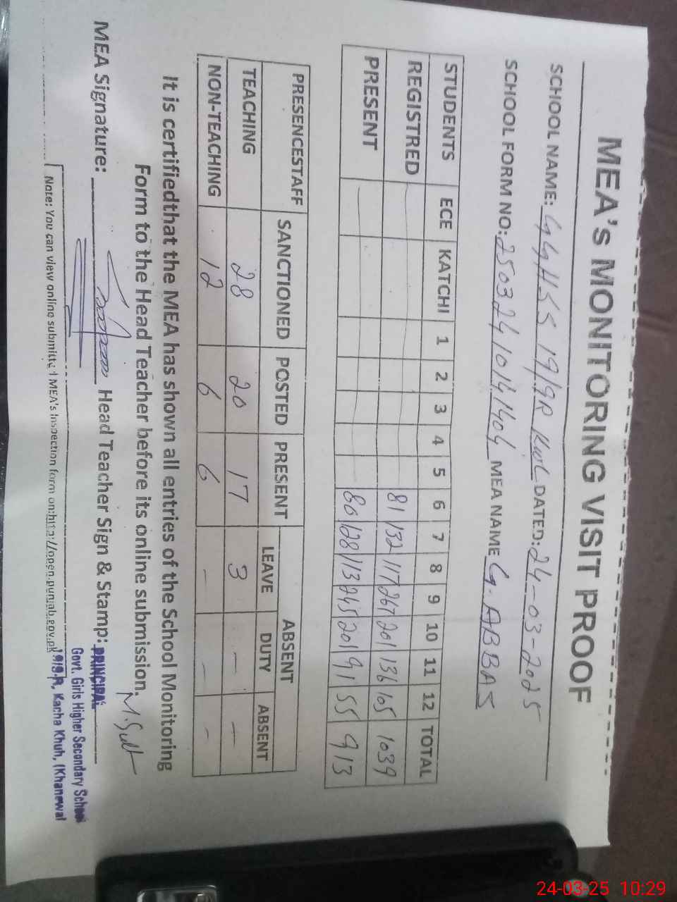 | Attendance Register | Head Teacher | MEA with School | Visit Proof |