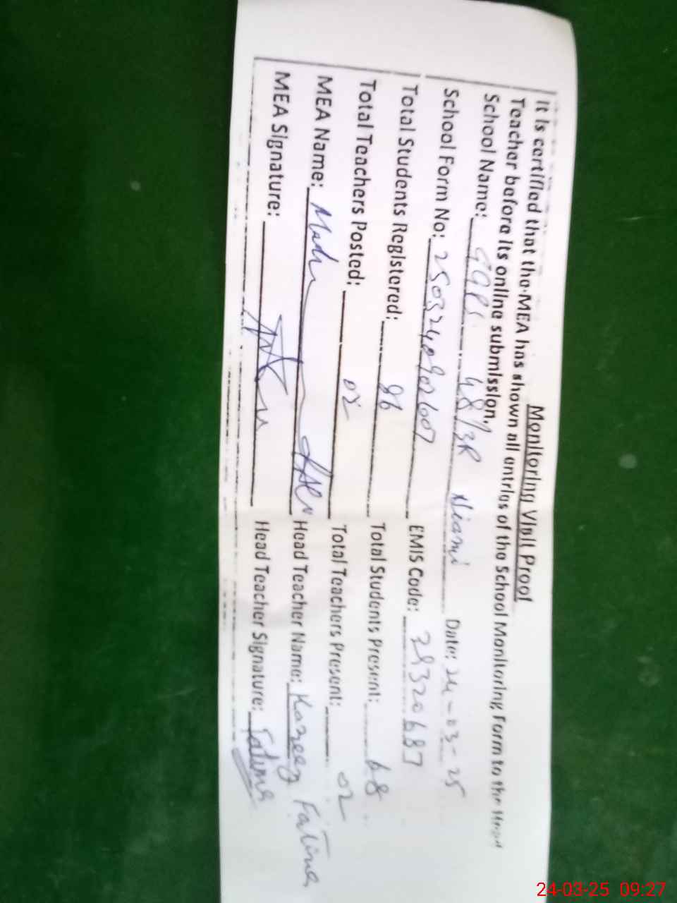 | Attendance Register | Head Teacher | MEA with School | Visit Proof |
