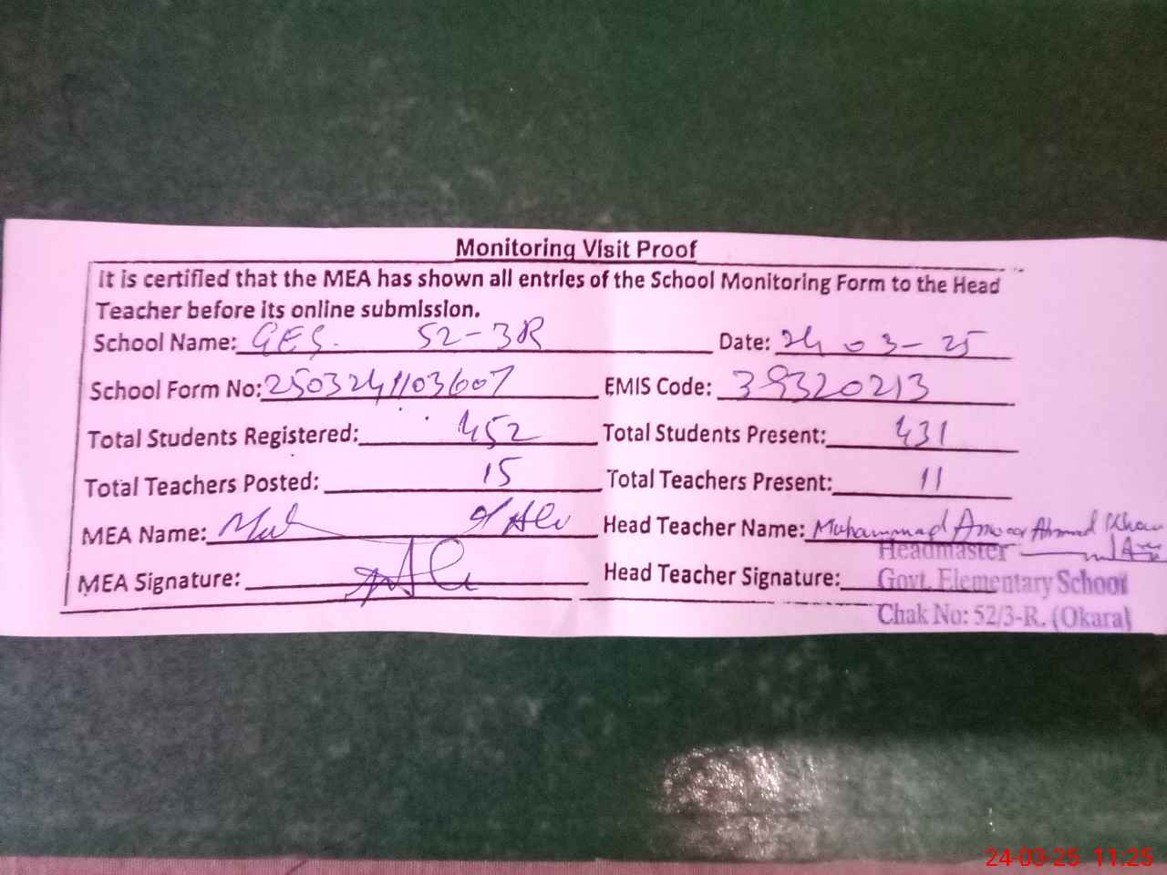 | Certified that this School was Inspected by the Undersigned MEA/DMO Today and the Information Stated Above is as Per Record. | |||||
