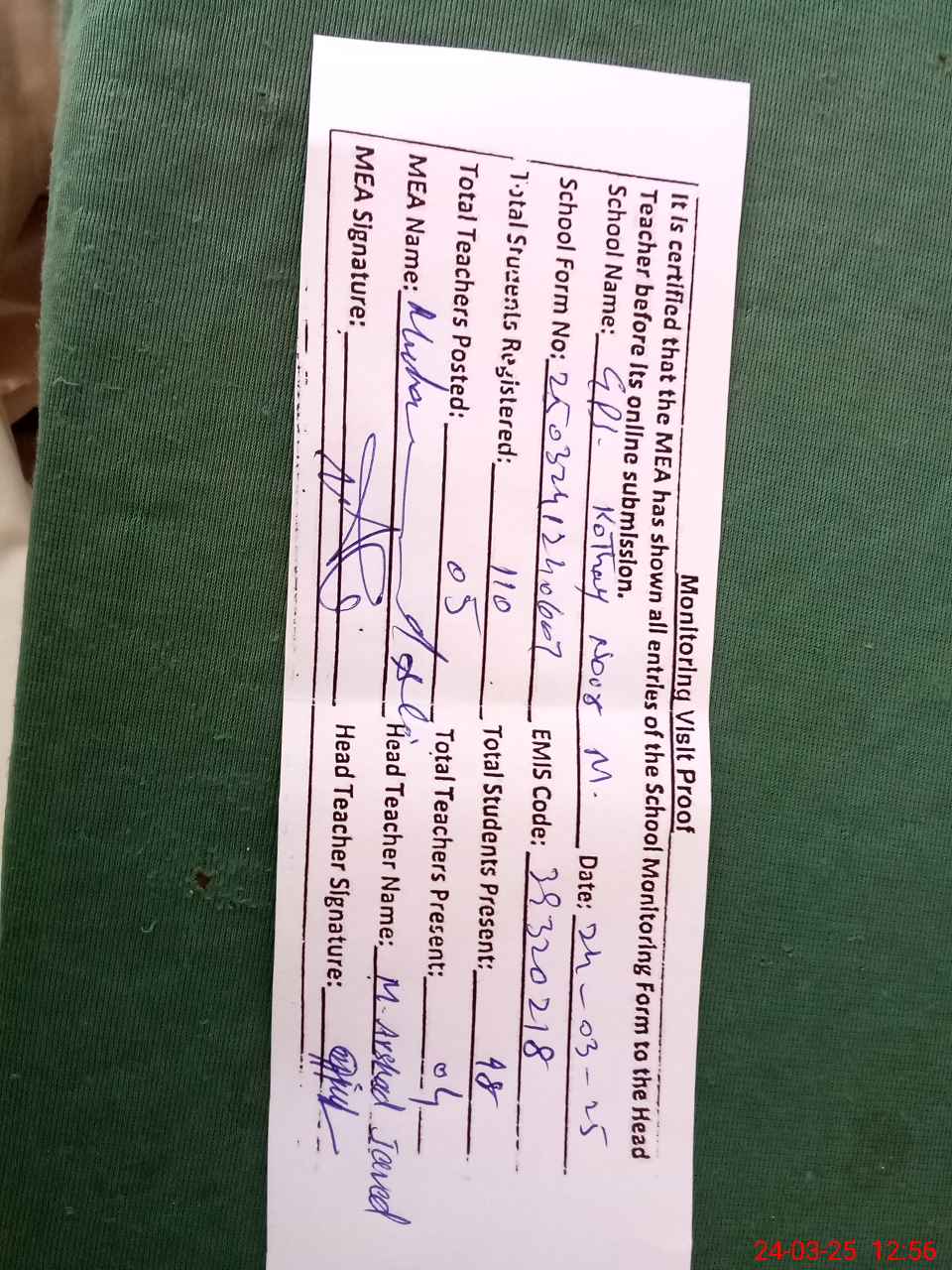 | Certified that this School was Inspected by the Undersigned MEA/DMO Today and the Information Stated Above is as Per Record. | |||||