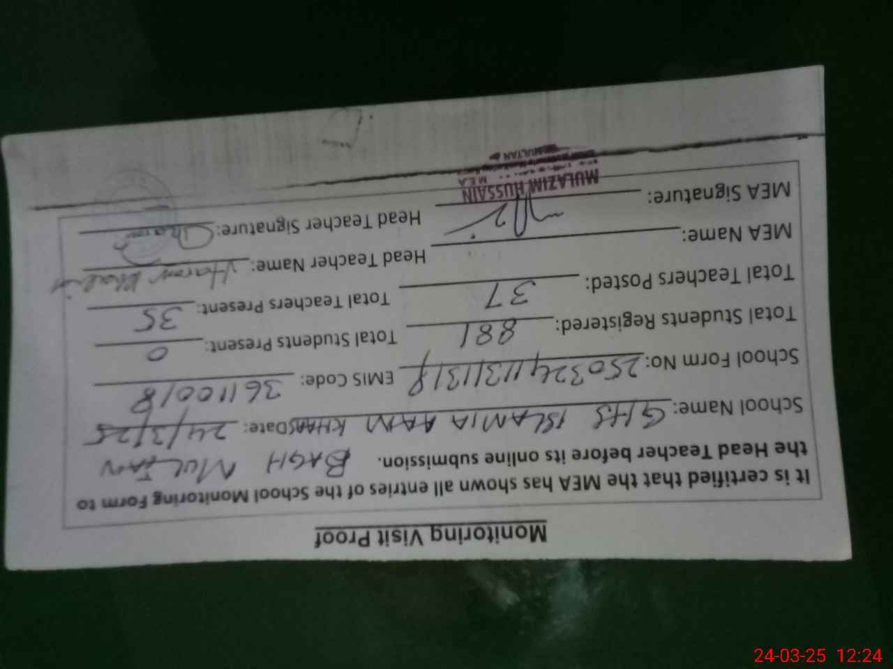 | Certified that this School was Inspected by the Undersigned MEA/DMO Today and the Information Stated Above is as Per Record. | |||||