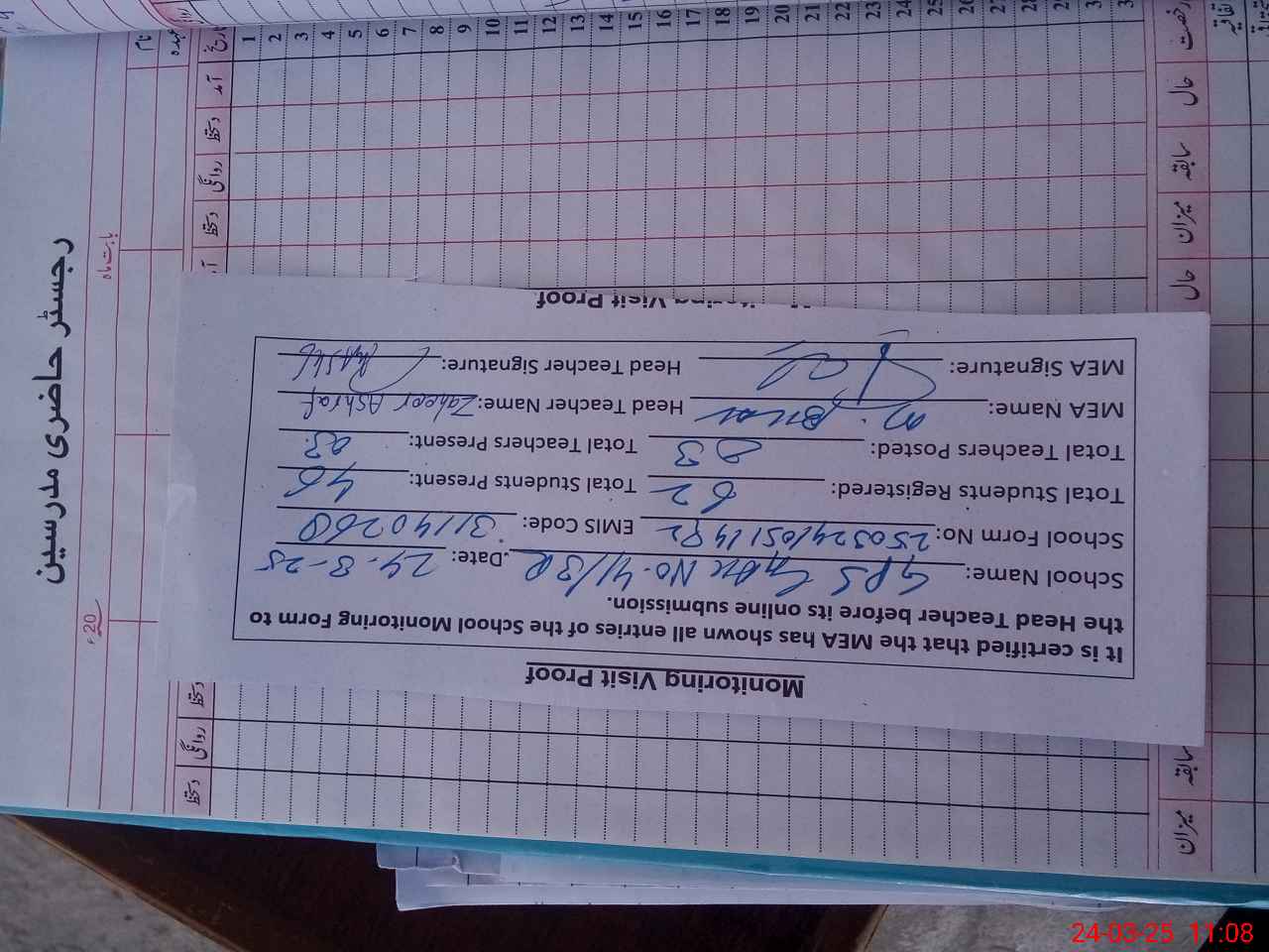 | Attendance Register | Head Teacher | MEA with School | Visit Proof |