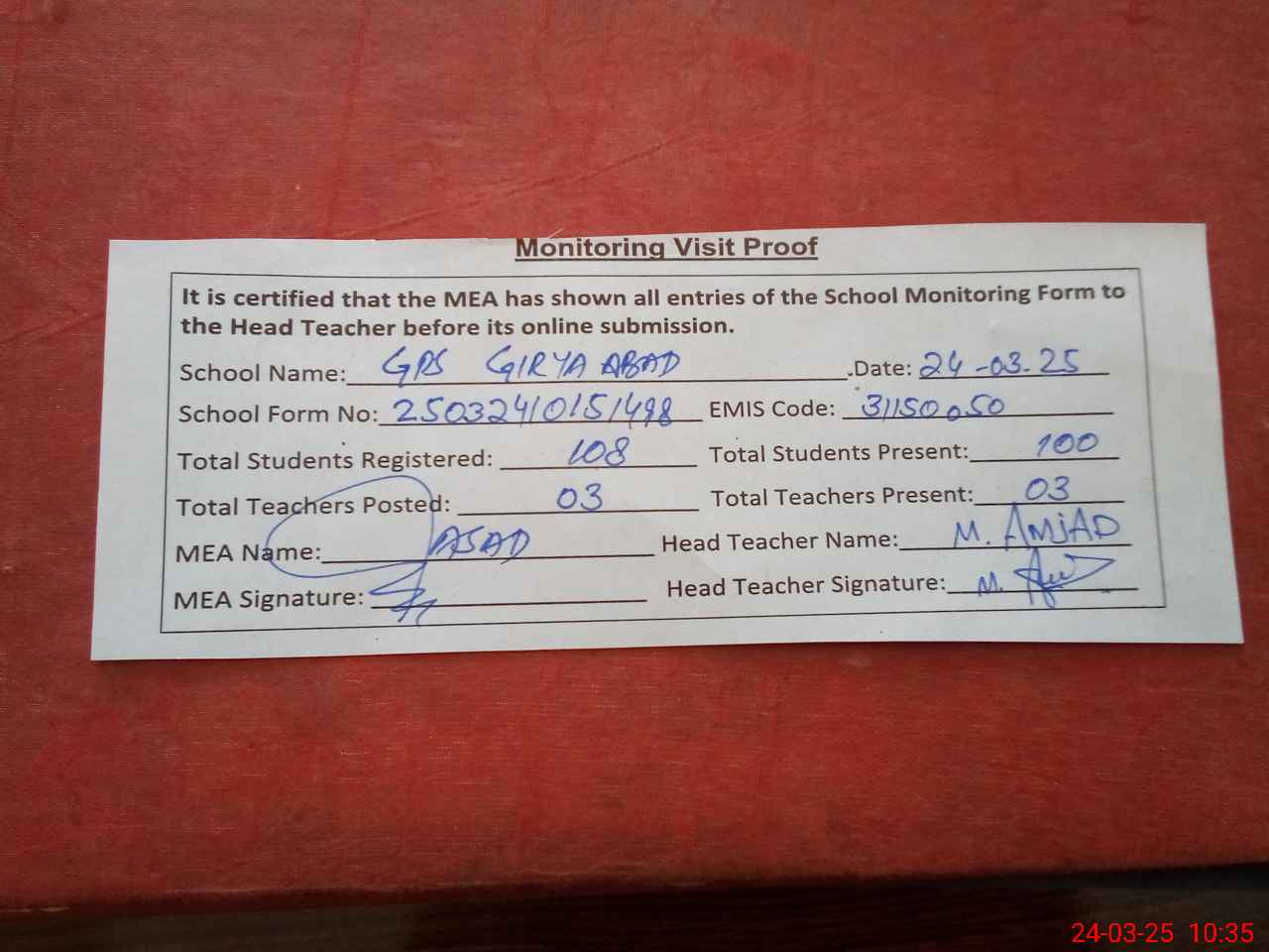 | EMIS Code: 31150050 | Name of School: GPS GIRIA ABAD | |||
