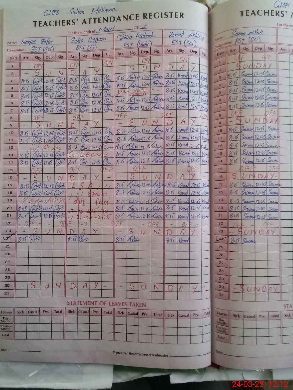 | Leave | Duty | Absent | Maternity | Medical | Ex- Pak |
