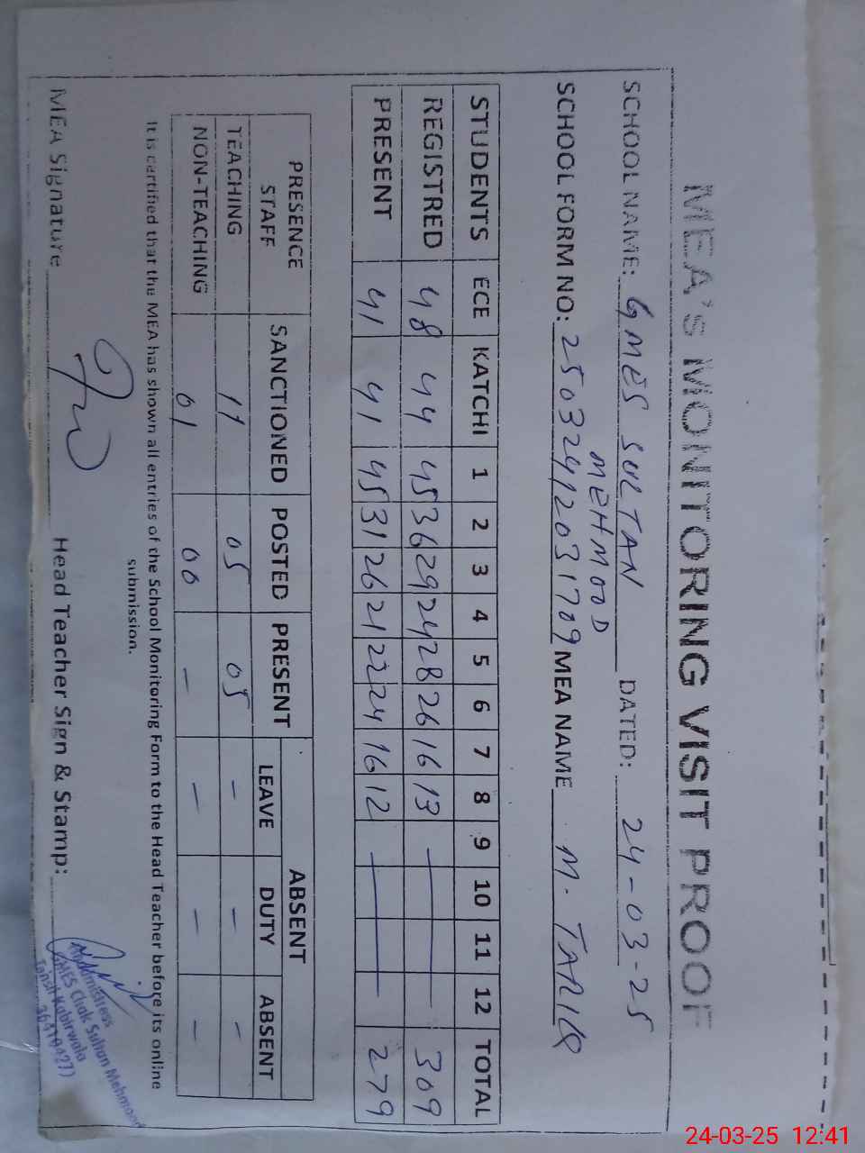 | Attendance Register | Head Teacher | MEA with School | Visit Proof |