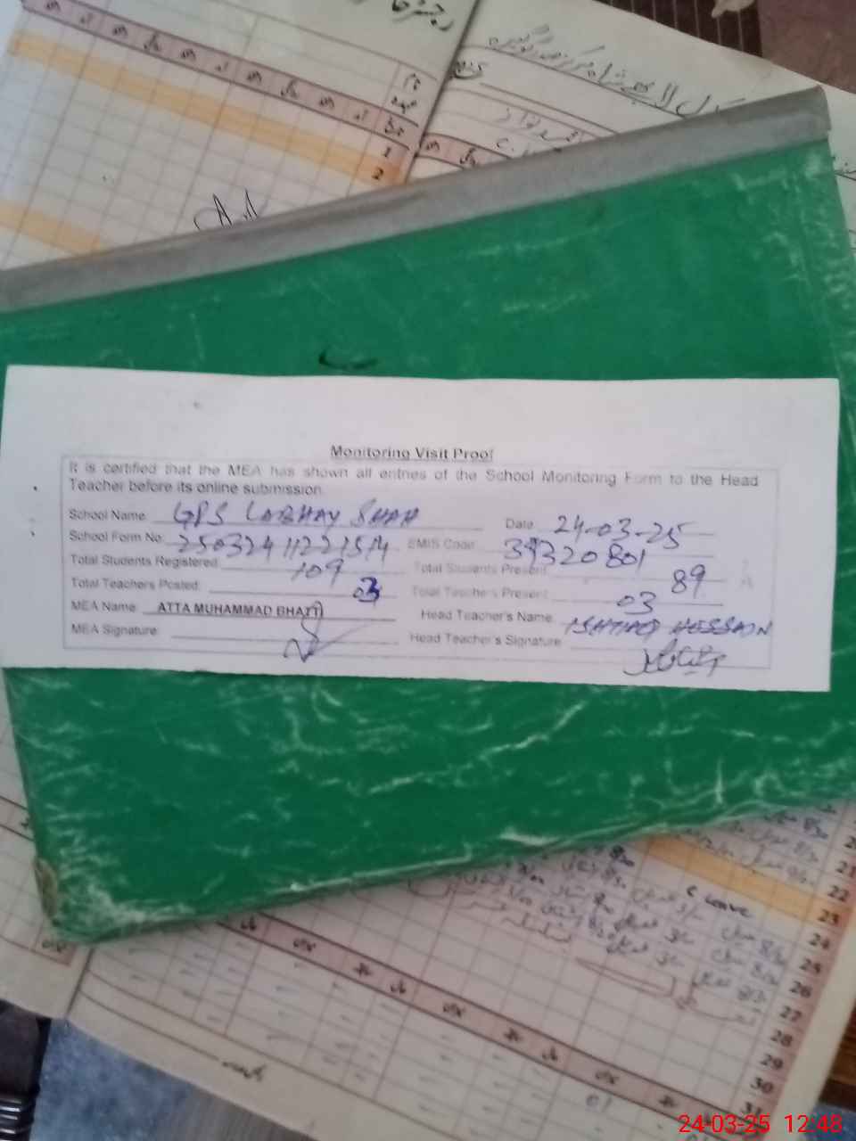 | Attendance Register | Head Teacher | MEA with School | Visit Proof |