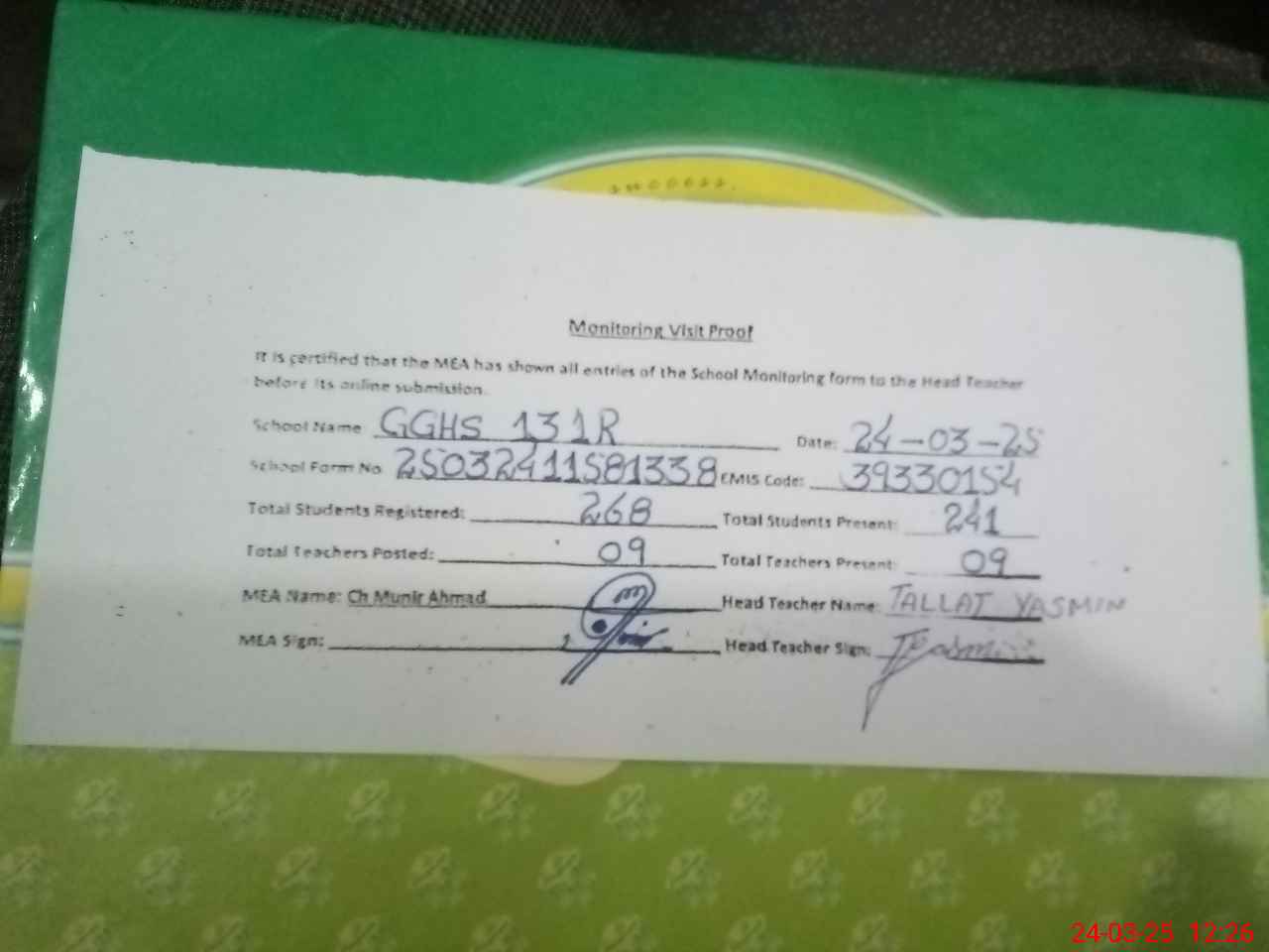 | Attendance Register | Head Teacher | MEA with School | Visit Proof |