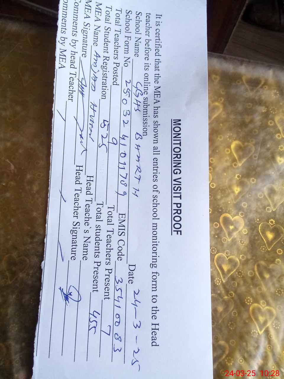 | Attendance Register | Head Teacher | MEA with School | Visit Proof |