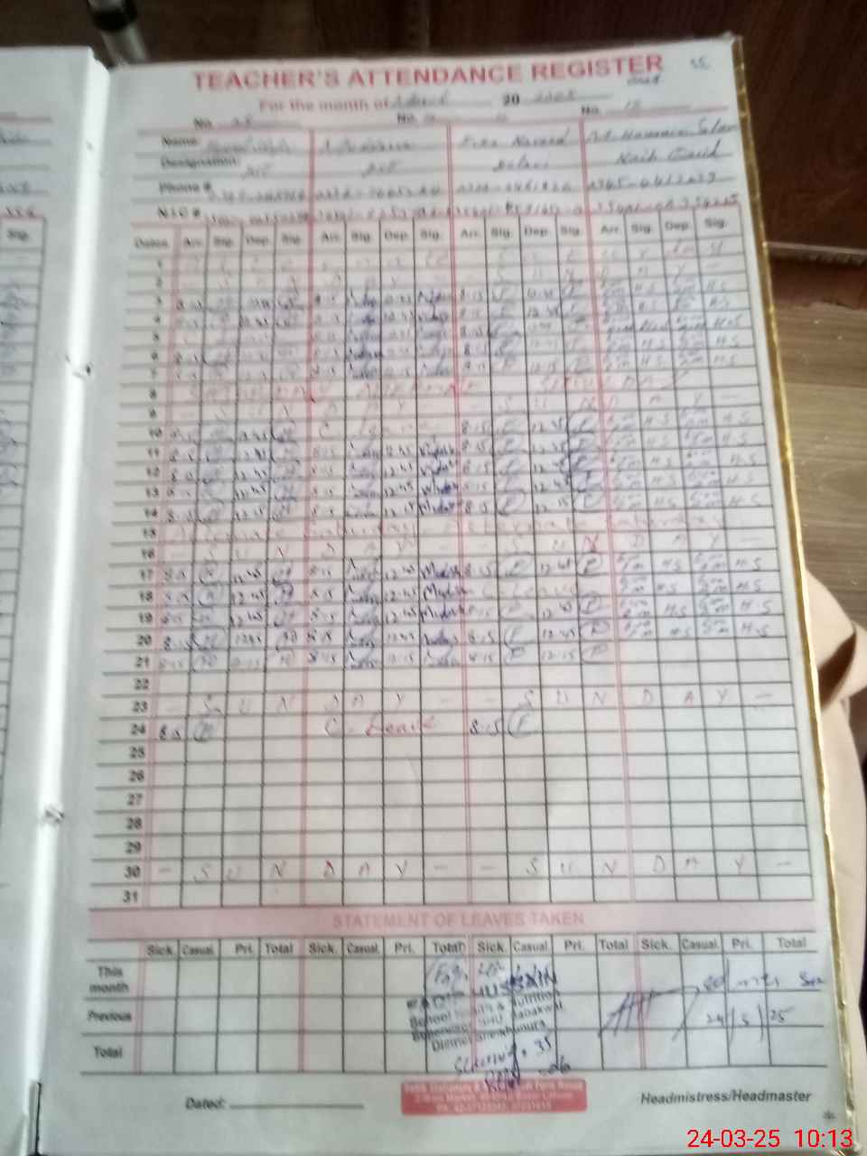 | CNIC | Full Name | Designation | R/C | Absence During Last Calender Month |