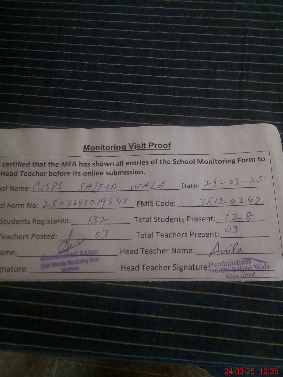 | Name: An**** Designation: (School Headmaster's/Headmistress's) PST Phone/Cell Number: 03**** |