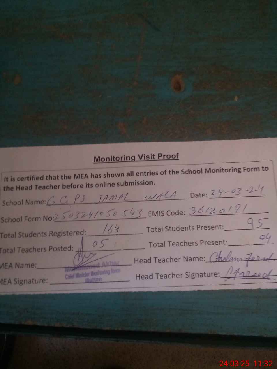 | Attendance Register | Head Teacher | MEA with School | Visit Proof |