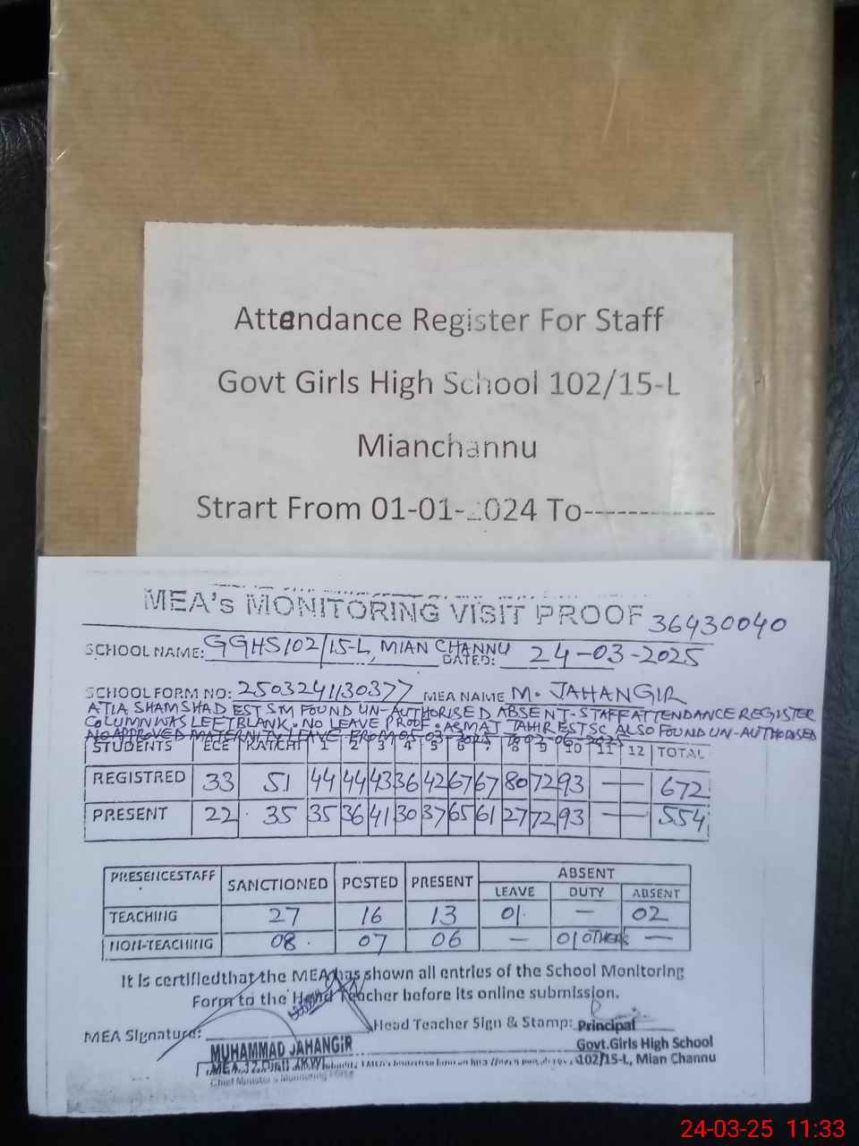 | Remarks (Use Separate Page if Required): ATIA SHAMSHAD EST SC FOUND UN AUTHORISED ABSENT FROM DUTY STAFF ATTENDANCE REGISTER COLUMN WAS LEFT BLANK NO LEAVE PROOF ASMAT TAHIR EST SC ALSO FOUND UN AUTHORISED ABSENT FROM DUTY NO APPROVED MATERNITY LEAVE FROM 05 MARCH 2025 TO 02 JUNE 2025 FOUR TOILETS FOUND LOCKED AND NON FUNCTIONAL LESSON PLANS ARE NOT AVAILABLE RANDOM CLASS FIVE IS NOW IN CLASS EIGHT | |||||
