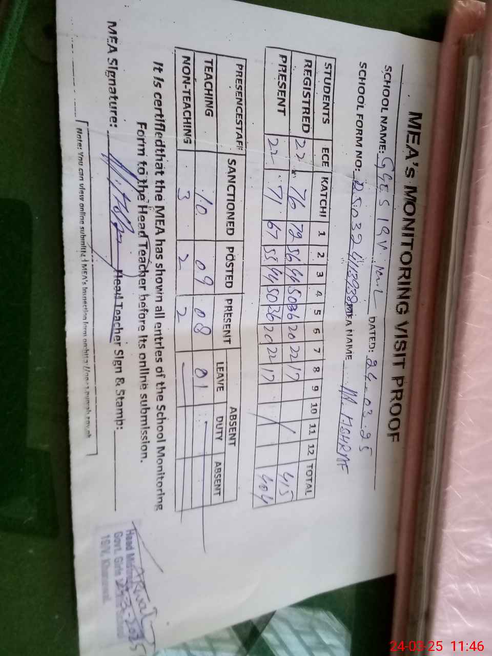 | Attendance Register | Head Teacher | MEA with School | Visit Proof |