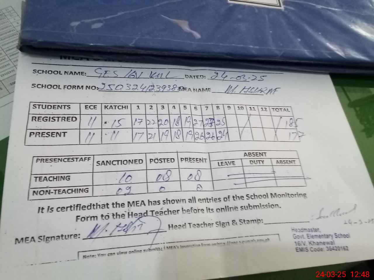| Attendance Register | Head Teacher | MEA with School | Visit Proof |