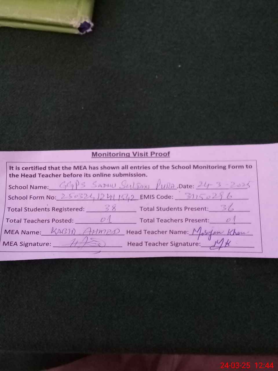 | Attendance Register | Head Teacher | MEA with School | Visit Proof |