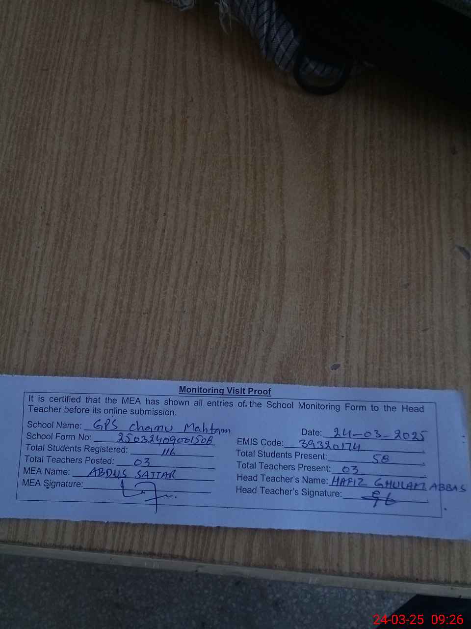 | EMIS Code: 39320174 | Name of School: GPS CHANU MAHTAM | |||