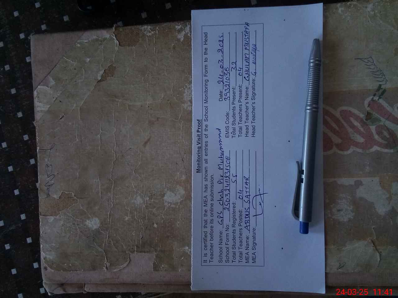 | Attendance Register | Head Teacher | MEA with School | Visit Proof |