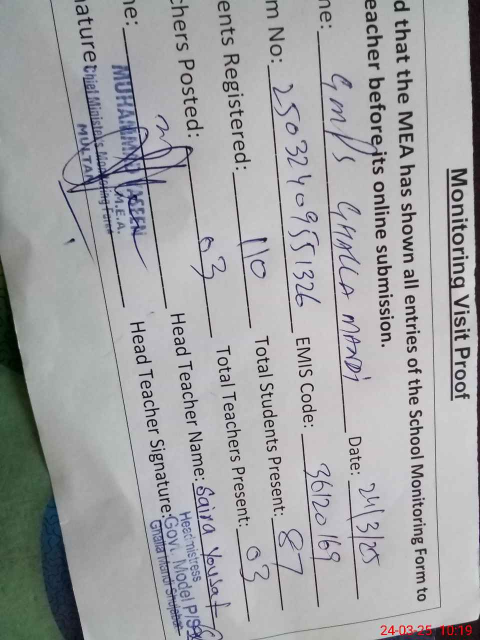 | EMIS Code: 36120169 | Name of School: GMPS GHALLA MANDI SHUJABAD | |||