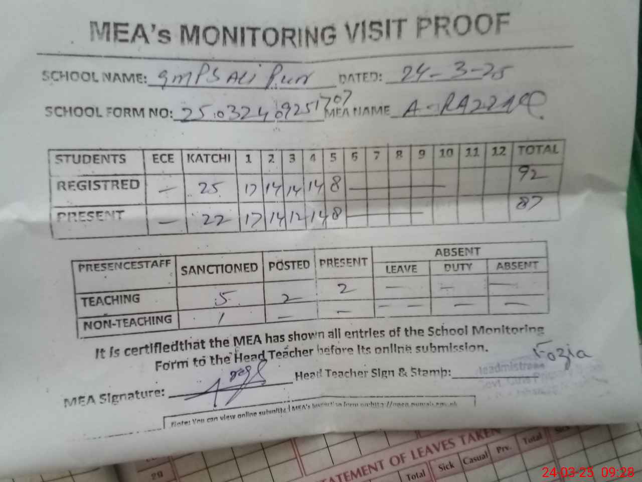 | Attendance Register | Head Teacher | MEA with School | Visit Proof |