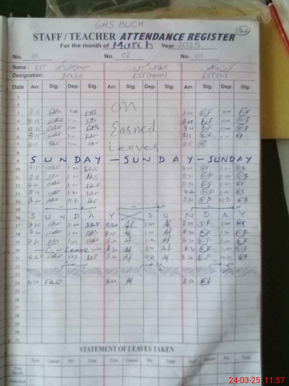 | 36**** | Fa**** Ha**** Kh**** | 1 | 1 | 0 | 0 | 0 | 0 | 0 | 0 | 0 | 0 | 0 | Exam Duty |