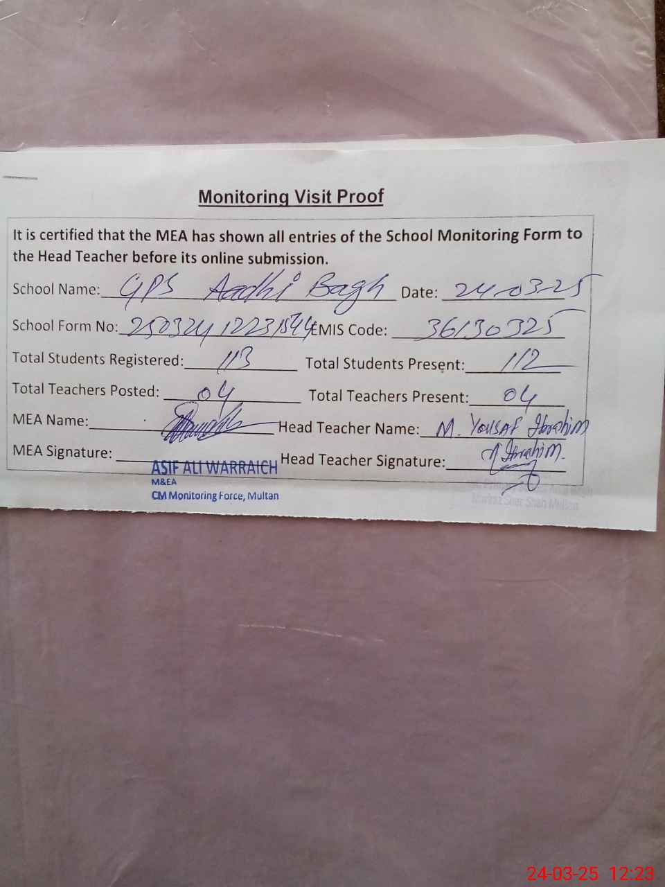 | Attendance Register | Head Teacher | MEA with School | Visit Proof |