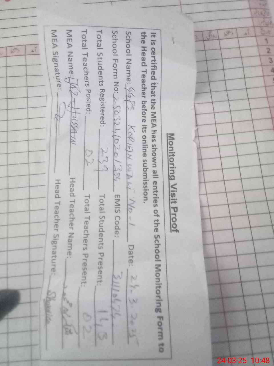 | Certified that this School was Inspected by the Undersigned MEA/DMO Today and the Information Stated Above is as Per Record. | |||||