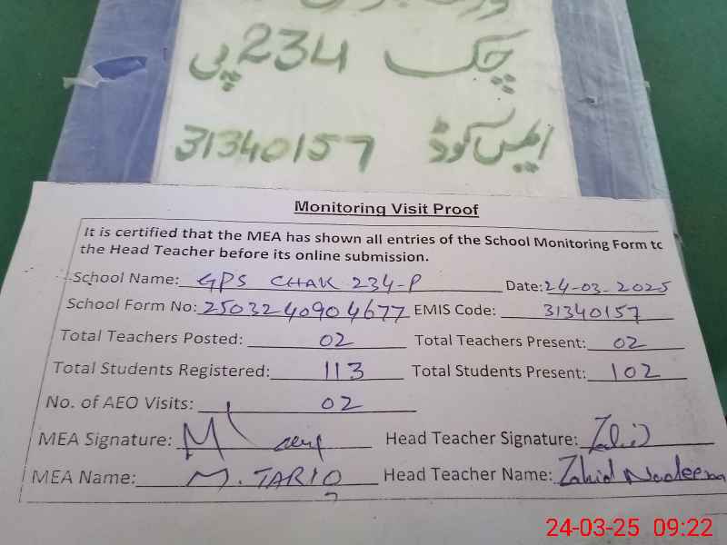 | EMIS Code: 31340157 | Name of School: GPS CHAK NO 234-P | |||