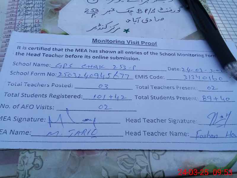 | EMIS Code: 31340160 | Name of School: GPS CHAK NO 253/P | |||
