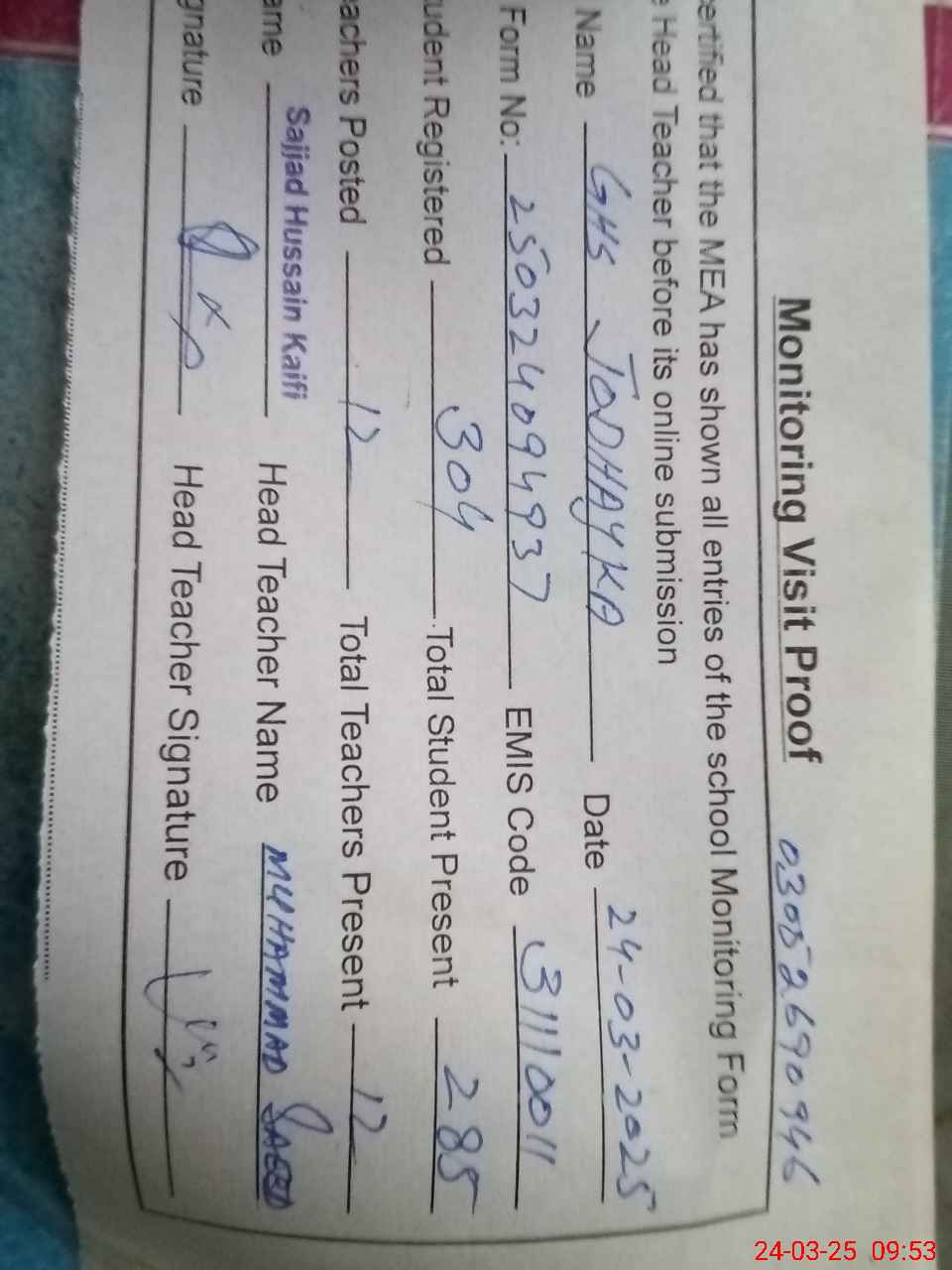 | Attendance Register | Head Teacher | MEA with School | Visit Proof |