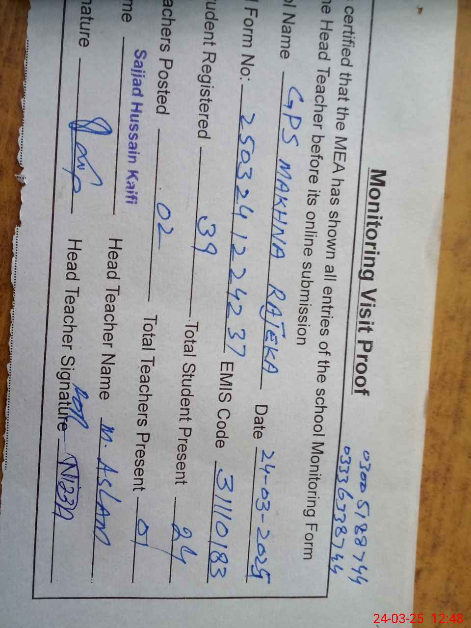 | Name: MU**** AS**** Designation: (School Headmaster's/Headmistress's) PTC/JV Phone/Cell Number: 03**** |