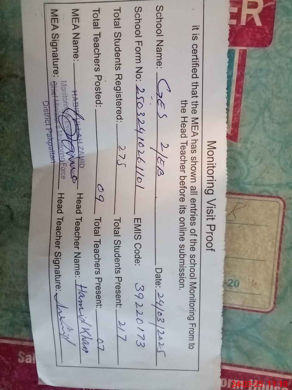 | Certified that this School was Inspected by the Undersigned MEA/DMO Today and the Information Stated Above is as Per Record. | |||||