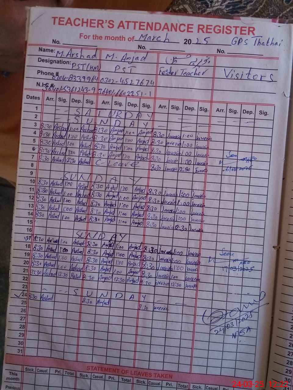 | Name: MU**** AR**** Designation: (School Headmaster's/Headmistress's) PST Phone/Cell Number: 03**** |