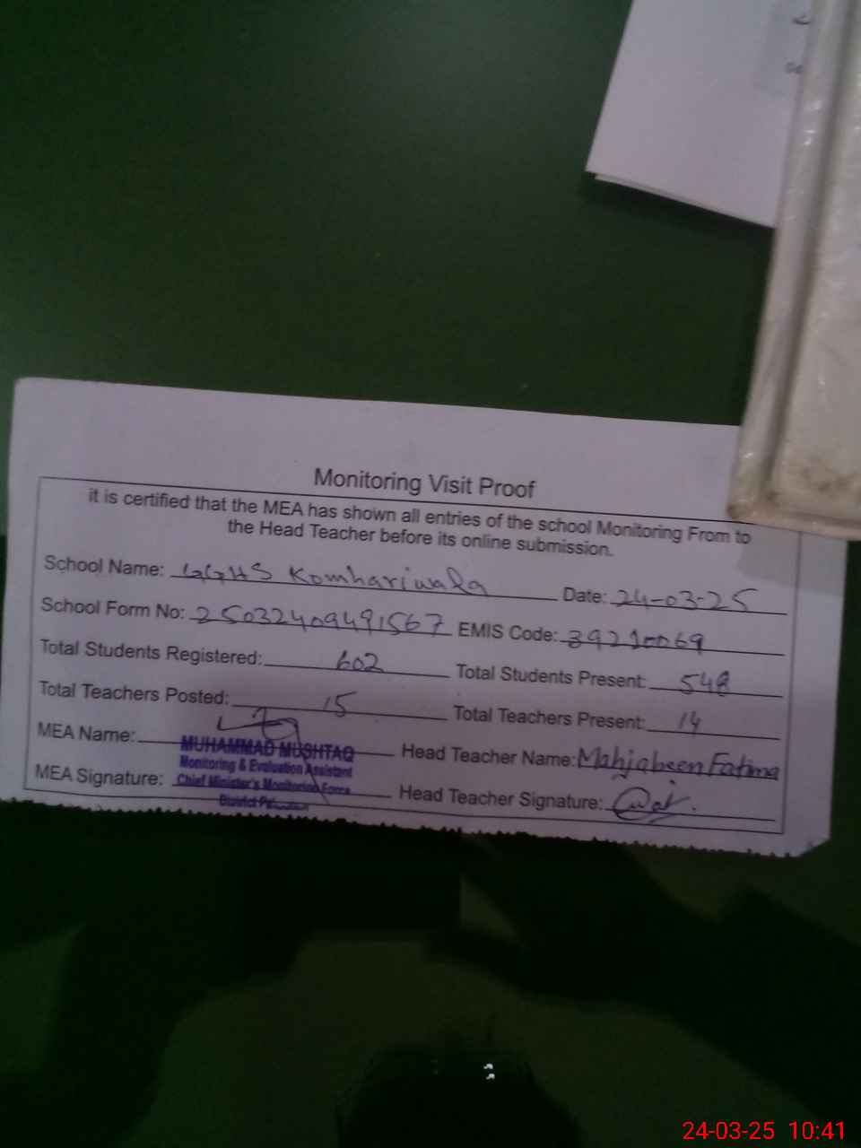 | Certified that this School was Inspected by the Undersigned MEA/DMO Today and the Information Stated Above is as Per Record. | |||||