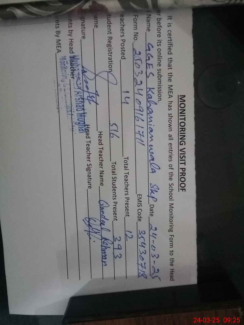 | Attendance Register | Head Teacher | MEA with School | Visit Proof |