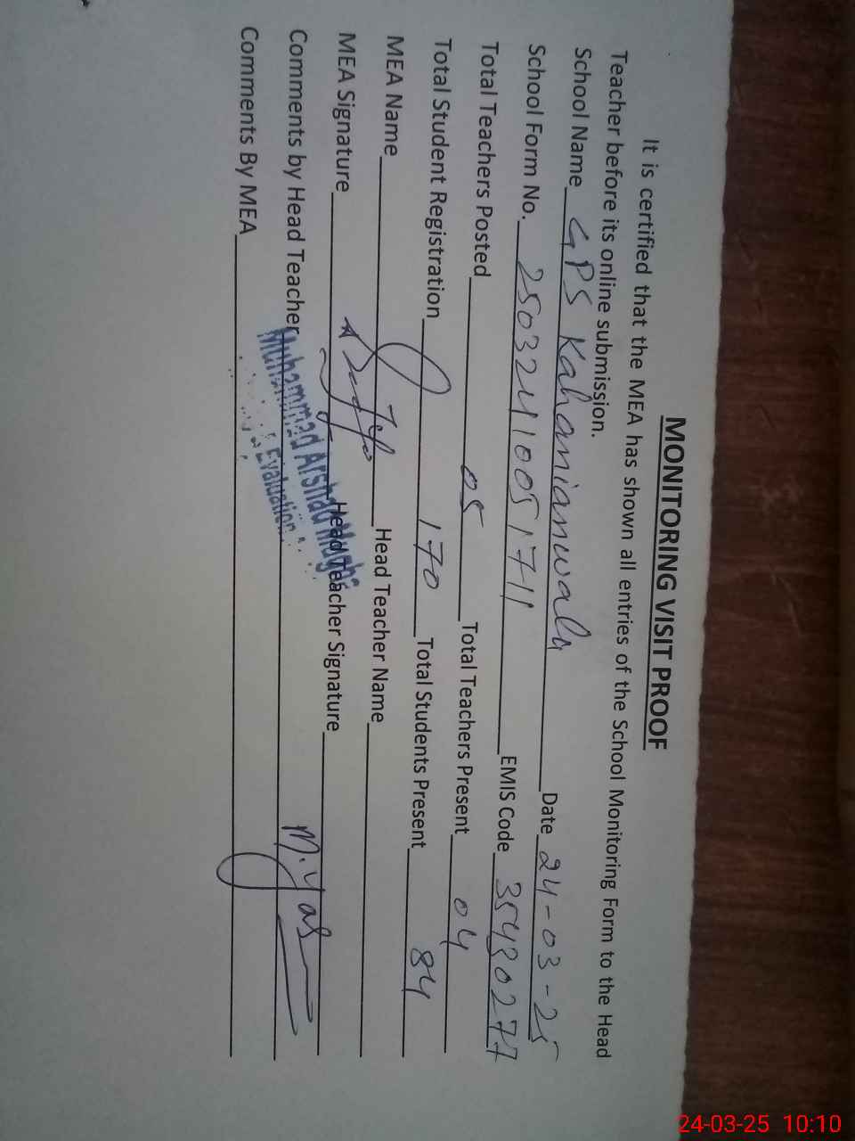 | EMIS Code: 35430277 | Name of School: GPS KAHANIAN WALA | |||