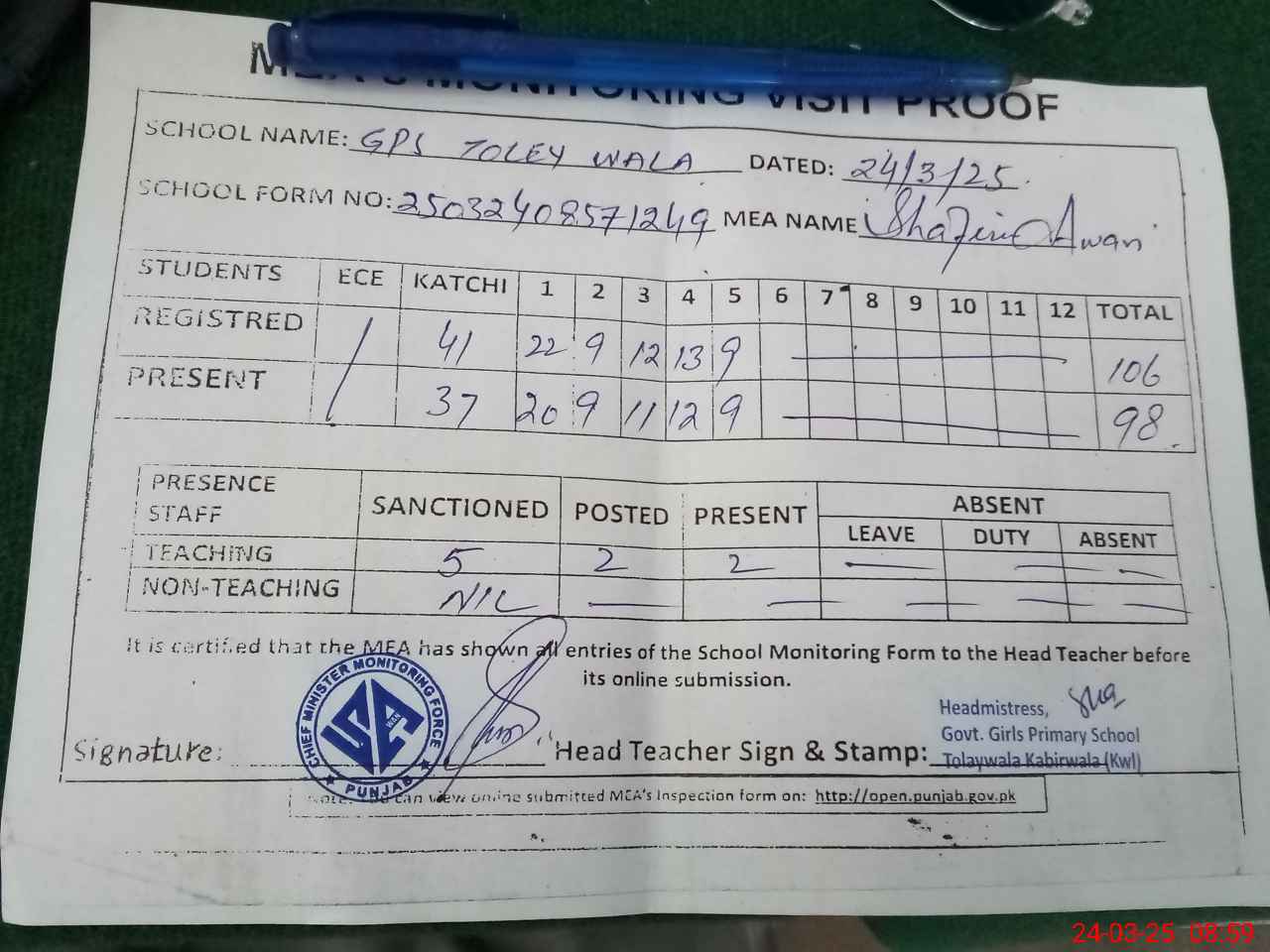 | Attendance Register | Head Teacher | MEA with School | Visit Proof |
