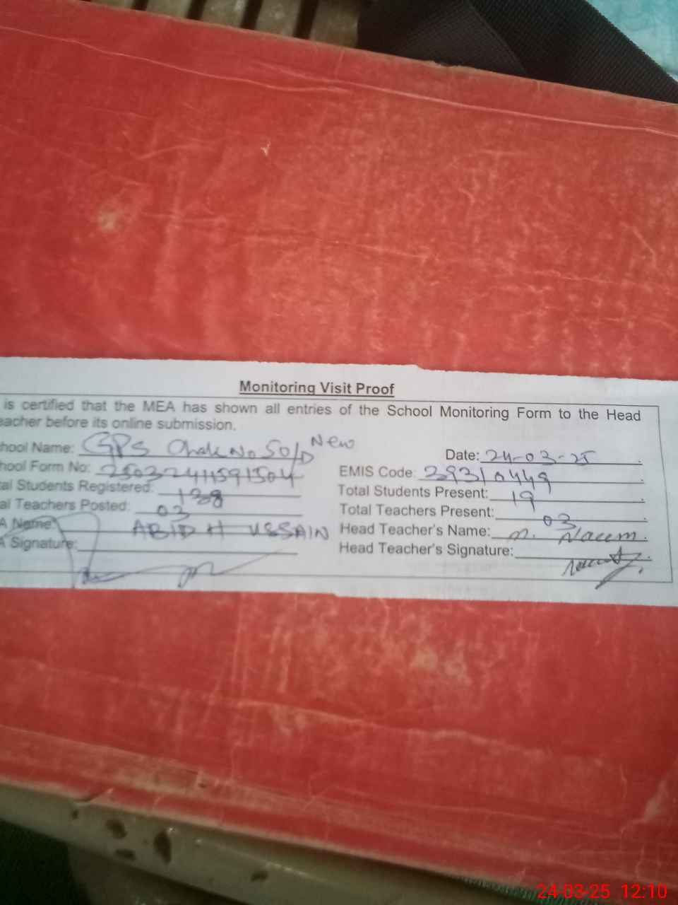| EMIS Code: 39310449 | Name of School: GPS CHAK NO. 50-D NEW | |||